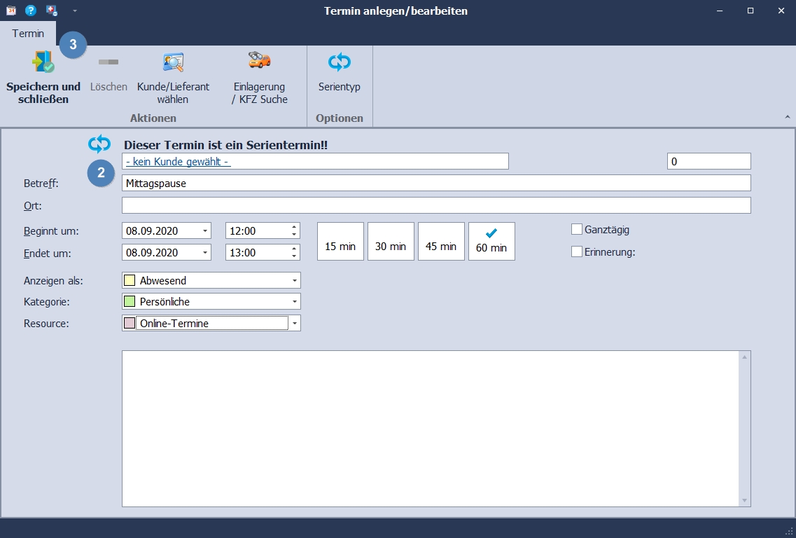 Wiederkehrende Termine wie Mittagspause im Online Terminplanerder PlusFakt Enterprise Reifen Software eintragen