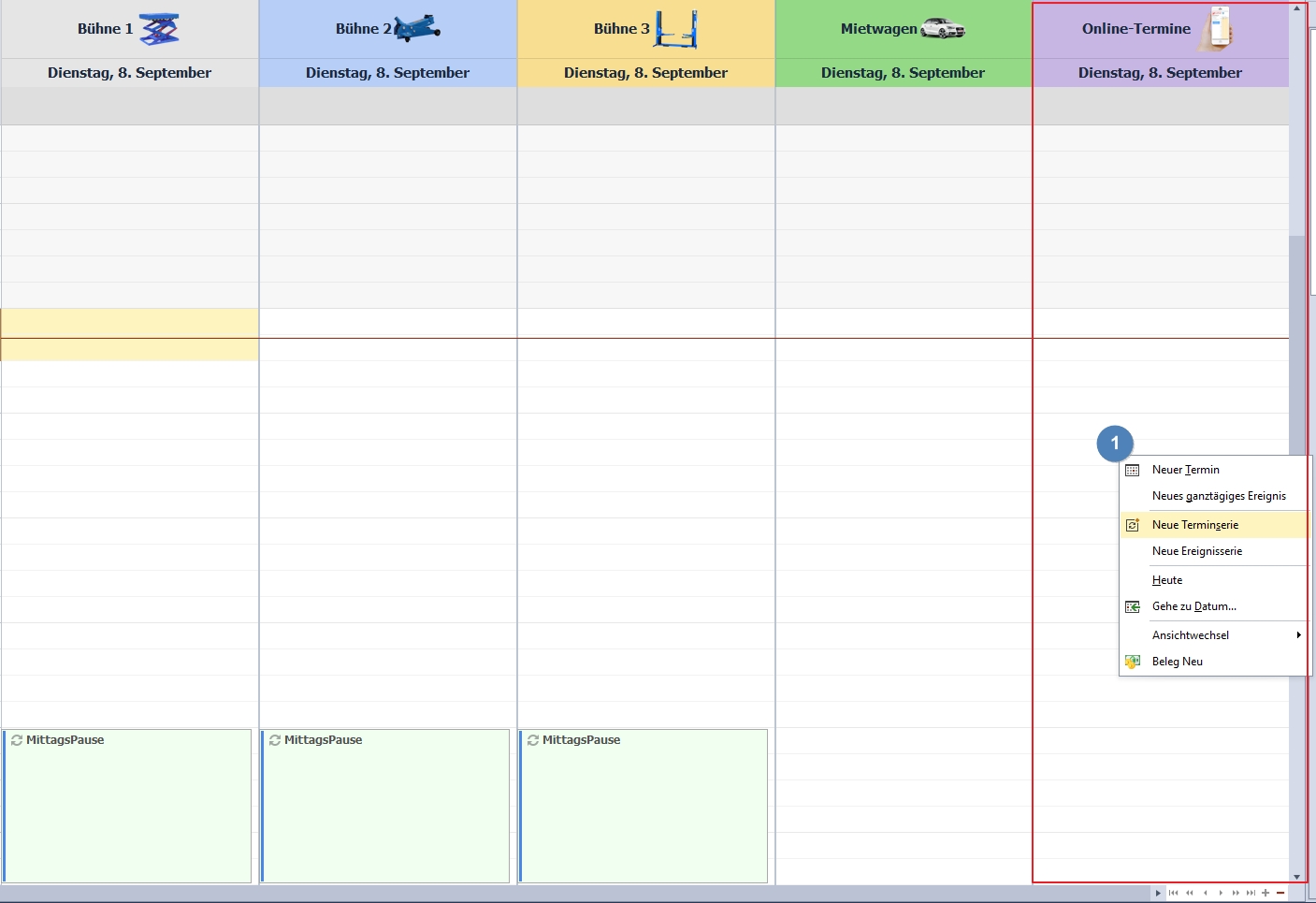 Wählen Sie die Bühne Ihres Online-Kalenders aus und tätigen dort einen Rechtsklick. Wählen Sie dann hier "Neue Terminserie"