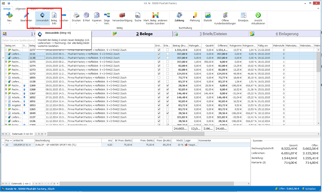 Wechseln Sie in der Kundenkartei auf das Register Belege des Kunden.